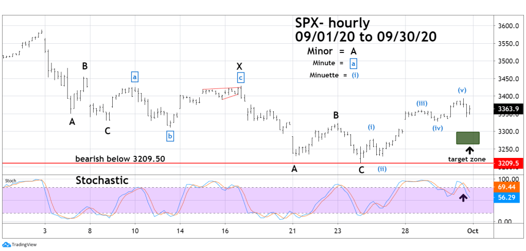 The hourly S&P 500 (SPX) chart courtesy of Trading View illustrates a choppy decline September 2to September 24.  This appears to be an Elliott Wave Double Zigzag corrective pattern.  The clearest part of the structure is the middle portion – labeled as Minor wave “X”.  This pattern looks very much like an Elliott wave – Expanding Flat.
