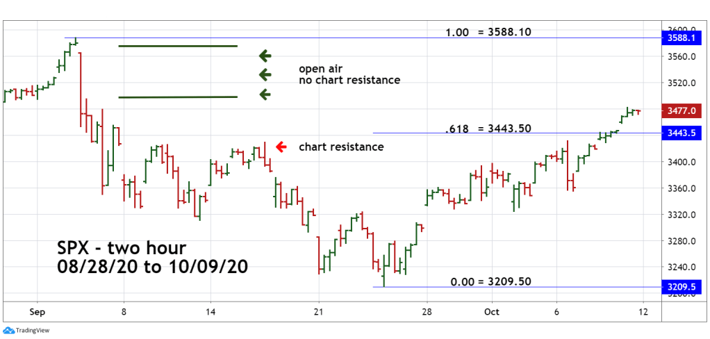 On 10/06/20 SPX broke above important chart resistance made on 09/16/20. On 10/08/20 SPX broke above Fibonacci resistance at 3443.50 which was a .618 retrace of the 09/02/20 to 09/24/20 decline. The next Fibonacci resistance level is in the area of the all-time high at 3588.10 which is a 1/1 retrace.