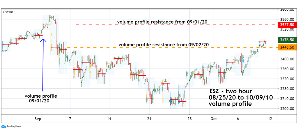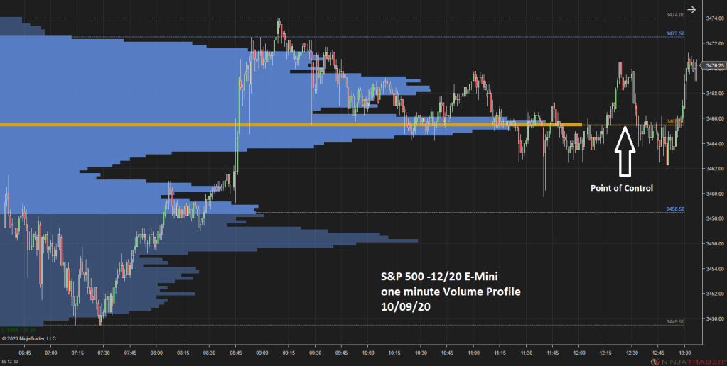 The next chart courtesy of Ninja Trader illustrates the Volume Profile for the S&P 500 – 12/20 E-Mini on 10/09/20.