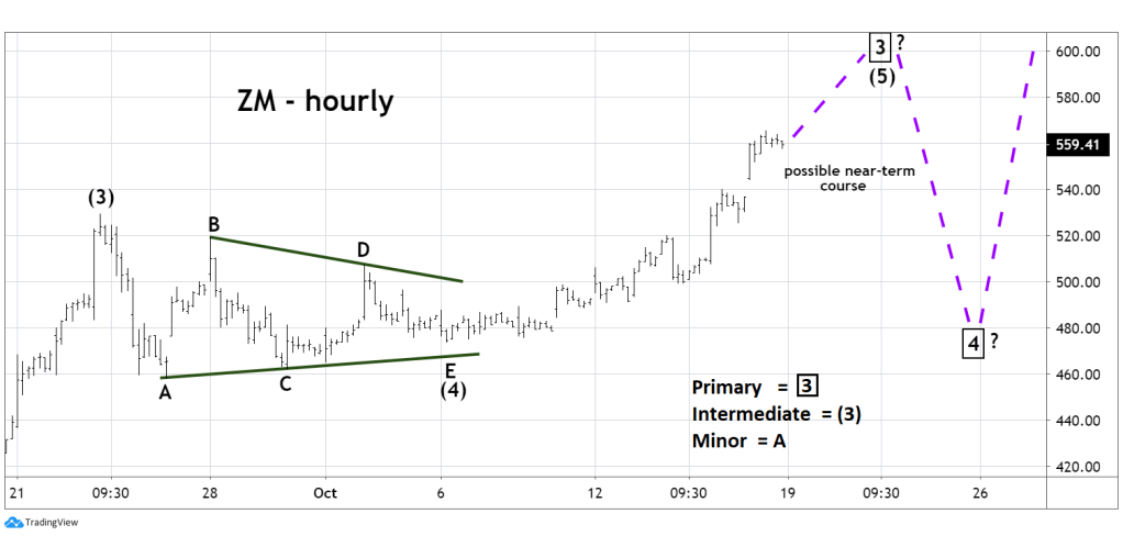 The hourly ZM chart courtesy of Trading View narrows the focus on the Elliott Wave count.