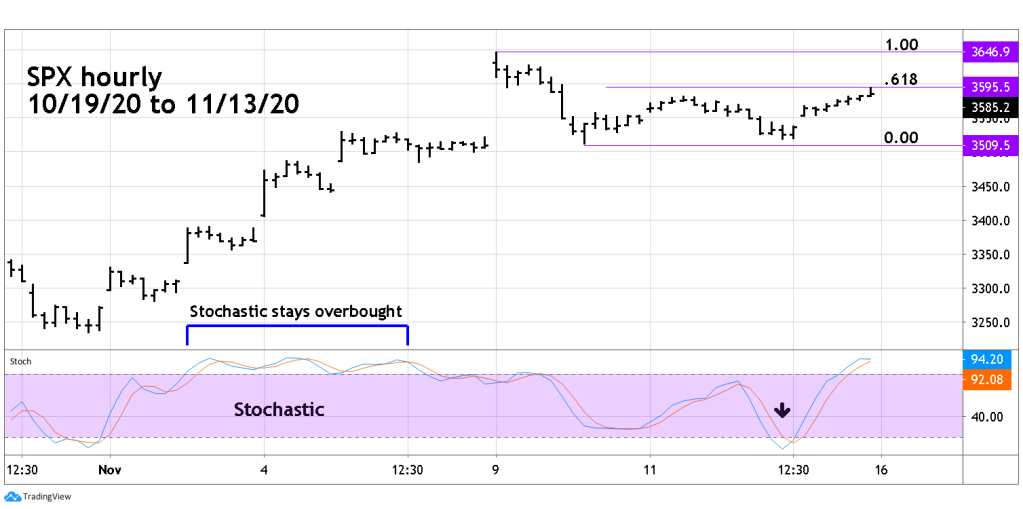 The hourly SPX chart courtesy of Trading View illustrates how the 11/12/20 bottom has held above the 11/10/20 low. It’s possible the November 12th bottom could hold – note the hourly Stochastic reached the oversold zone, and there could be additional bullish evidence on 11/16/20.