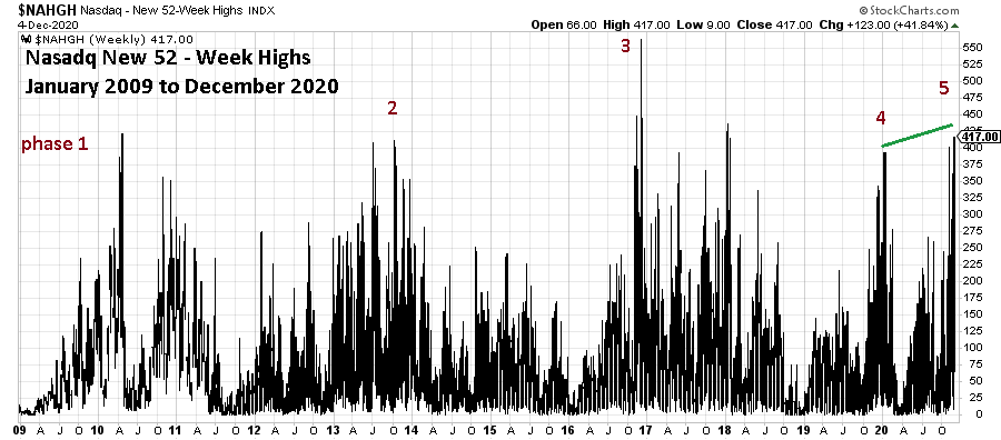 After the 11/09/20 maximum phase five new highs was made prices continued higher, yet new highs decreased creating a bearish divergence. On 12/4/20 these bearish divergences were erased. This is typical of late-stage stock bull market which could have several false bearish signals before the final price peak is in place.