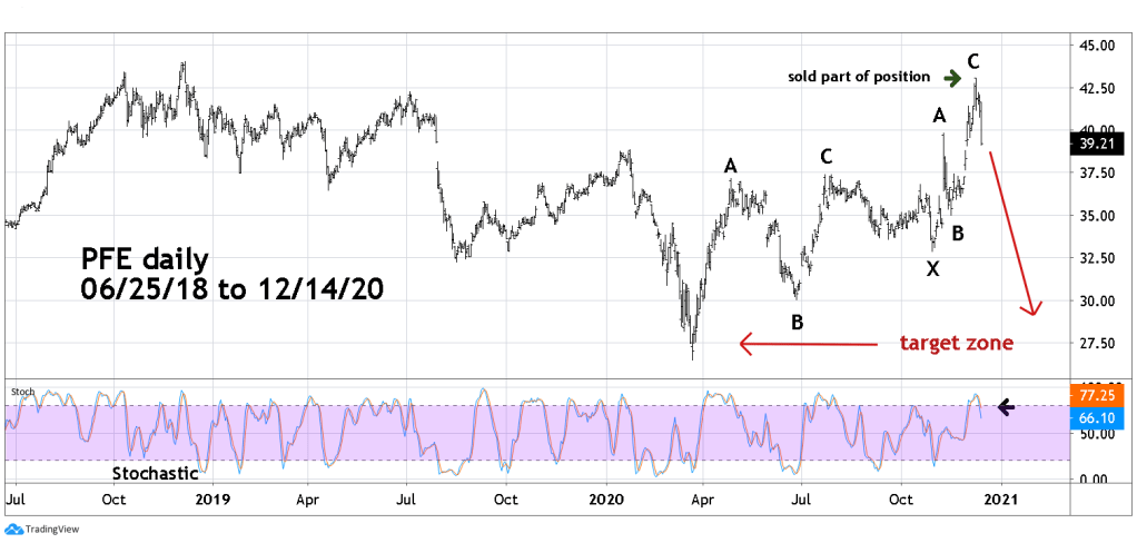 This was noted and anticipated in the 12/08/20 post “Pfizer Nearing Resistance”. A recommendation was made to sell half of the remaining PFE position at the open of trading the next day. The opening PFE price on 12/09/20 was 43.07, the high that day was 43.08 and the stock has been in a down trend since that day. The closing price today was 39.21.
