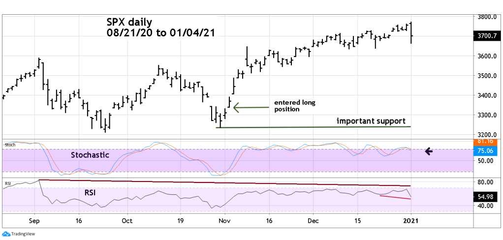 Today 01/04/21 in the first minute of trading on the first trading day of the new year the S&P 500 (SPX) made a new all-time high then had a sharp decline. The SPX began the day up 8 points it ended the day down 55 points.