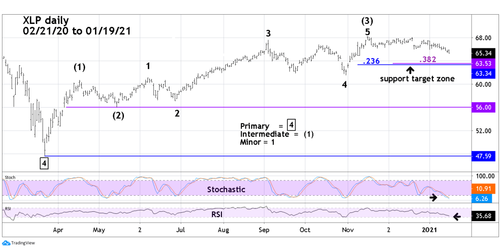 This drop is probably Intermediate wave (4). Wave four declines can find Fibonacci support at two retrace levels: retracement of the third wave, and retracement of the prior three waves. The daily XLP chart courtesy of Trading View illustrates the two potential support zones.