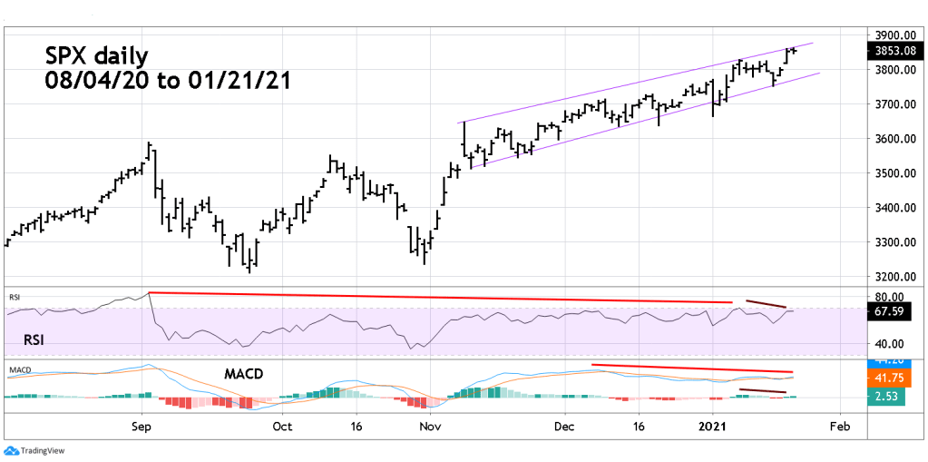 Today 01/21/21 the S&P 500 (SPX) made a marginal new all-time high. While doing this both external and internal momentum indicators gave clear bearish signals.