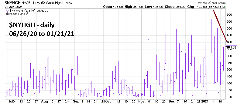 The daily NYSE – New 52 – Week Highs ($NYHGH) chart courtesy of StockCharts.com illustrates an internal momentum indicator.