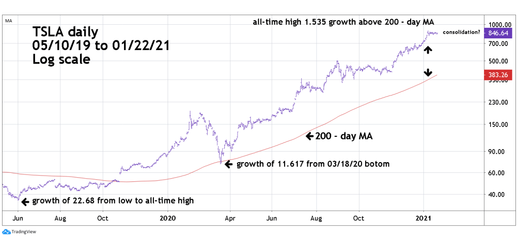 So far TSLA has a growth rate above its 200 – day MA of 1.535 slightly less than ZM.  However, its growth rate since March 2020 is 11.617, faster and greater than the one-year growth of ZM. Also, note  that since TSLA all-time high it’s been in a narrow shallow decline.  When you see a market, or a stock make a rapid ascent followed by a sideways movement, it is in most cases  just a correction prior to another thrust to new highs.