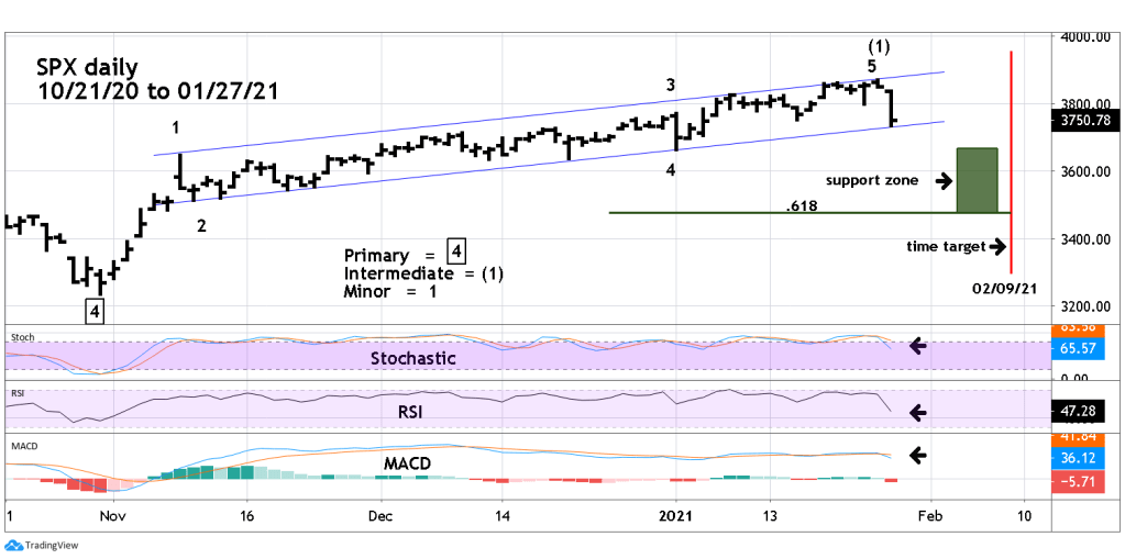 Today 01/27/21 the S&P 500 (SPX) broke below chart support made on 01/25/21 and 01/15/21. This is the first time since the rally began on 10/30/20 that the SPX has broken two support levels – powerful evidence that at least a minor decline has begun.