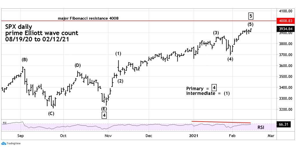 As noted in my February 9, 2021 post “Dow Jones Industrial Average – 55 – Year Anniversary” a problem with the 4008 Fibonacci target is that it’s too close to the obvious 4000 target. Perhaps the SPX could top below 4000. It could also slightly exceed the target to perhaps SPX 4050.