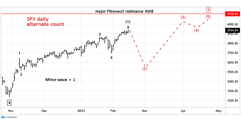 The best alternate count has the rally from October 30, 2020 to February 12, 2021 as just Intermediate wave (1) of a larger developing five – wave pattern.