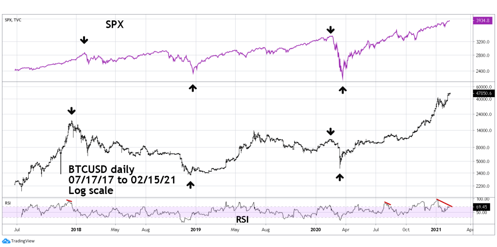 As of February 12, 2021, both BTCUSD and SPX were making new bull market highs. If BTCUSD continues its relationship, SPX could make a new high one week to a month and a half after BTCUSD makes its bull market climax.