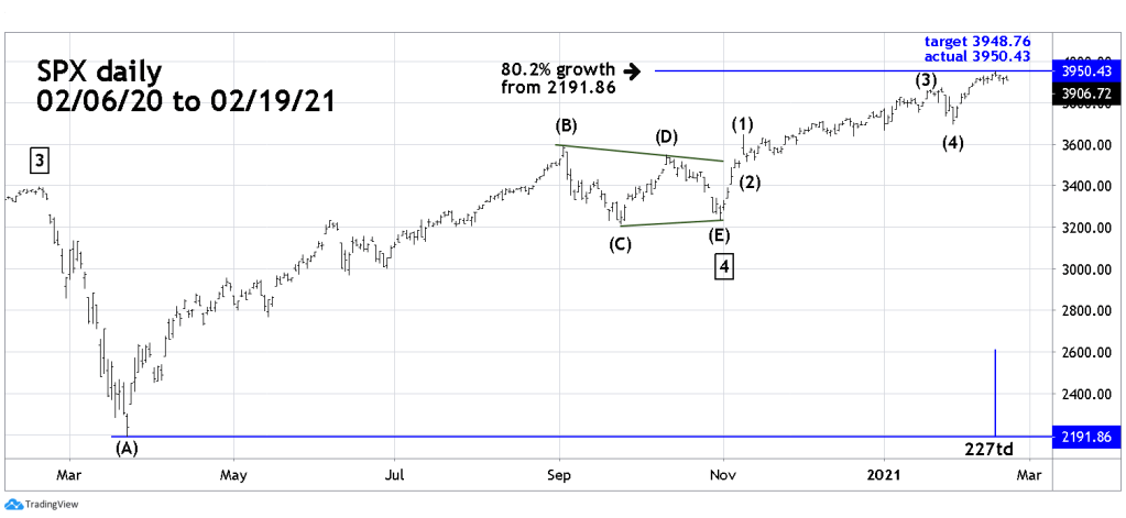 As of 02/16/21 the SPX growth from the March bottom was 80.2% the exact match with the 2009 to 2010 rally is at SPX 4008. The bull move from 03/23/20 has so far been 227 trading days. To equal the 2009 to 2010 rally, the current movement would have to continue until 05/11/21.
