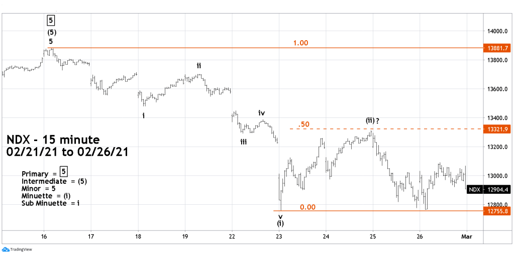 So far NDX has a much clearer Elliott wave count than the S&P 500 (SPX), which from 02/16/21 to 02/26/21 has a very choppy pattern. As of 02/26/21 SPX looks more like a corrective pattern of the recent uptrend. An SPX move below its 02/26/21 bottom would imply something more bearish developing.
