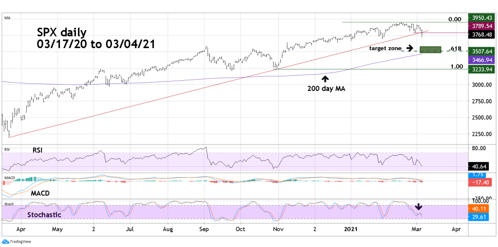 Today 03/04/21 the S&P 500 (SPX) broke below the rising trendline from the bottoms made on 03/23/20 and 10/30/20. Additionally, the short- term bottom at 3789.54 made on 02/26/21 was also broken. These dual breaches of support contribute to the massive amount of evidence that US stocks may have formed an important top.