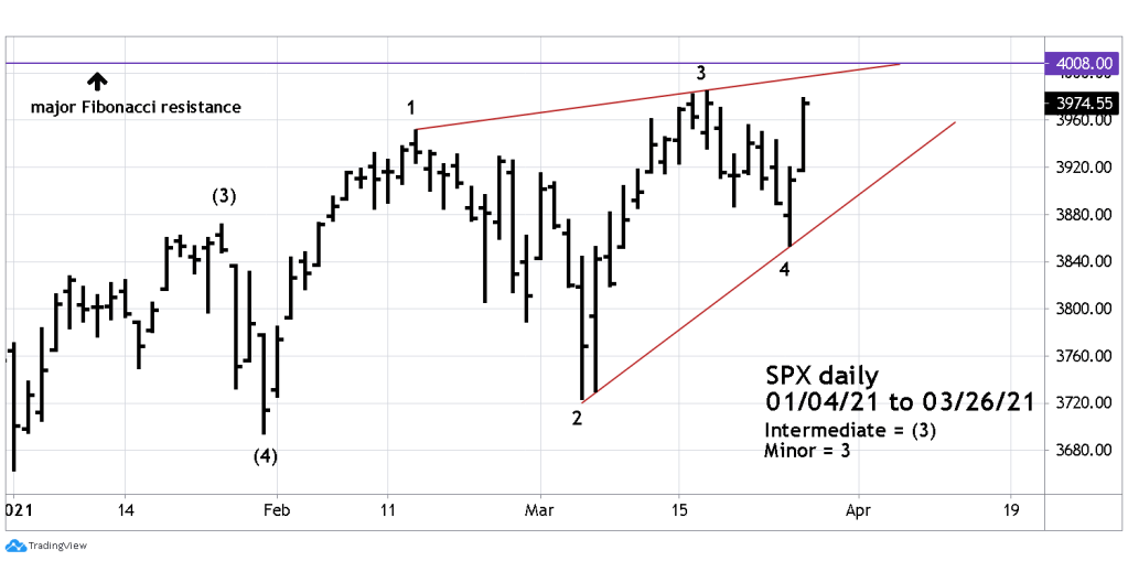 An Elliott wave – Ending Diagonal Triangle (EDT) from late January 2021 is probably under construction. Typically, in EDT’s there’s a marginal break beyond the trend line connecting the termination points of waves “one” and “three”. If there’s a move above the trend line on 03/29/21 it could terminate near SPX 4008.