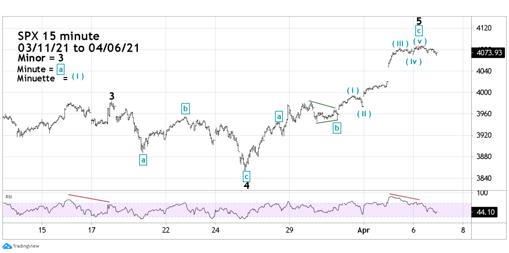 The SPX 15 – minute chart courtesy of Trading View illustrates the progress from the supposed Minor wave “3”.