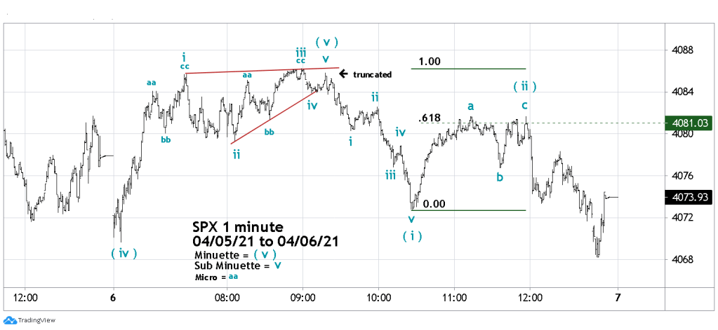 The last hour decline went below the EDT point of origin at 4069.61.  If the rally into the high of the day was a completed EDT there’s a high probability the SPX could trend down throughout most of 04/07/21.
