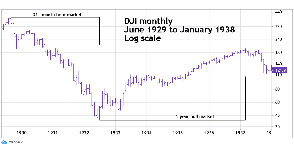 The DJI monthly chart showing the 1929 to 1937 bear and bull phase gives historical perspective.