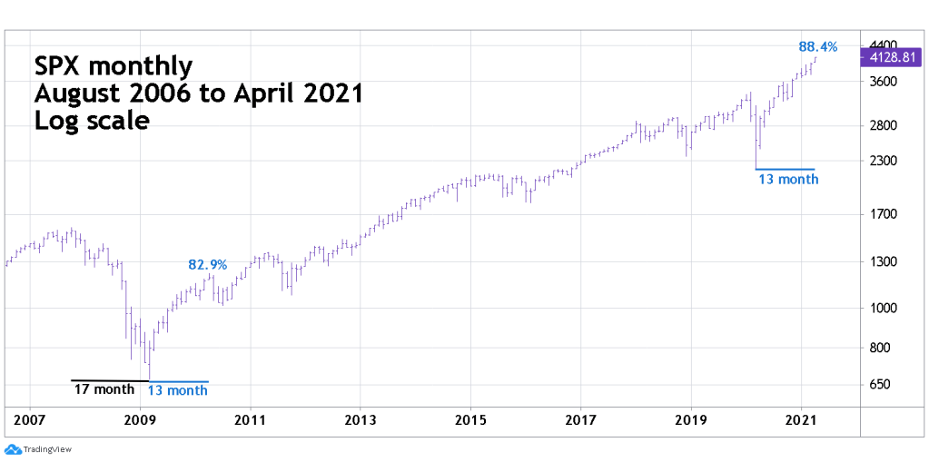 On 04/09/21 the S&P 500 (SPX) achieved a gain of 88.4% from the 03/23/20 bottom, this is one of the farthest and fastest gains in US stock market history. In 1999 the Nasdaq Composite had a faster and larger move; however, this was primarily because of concentrated buying in the technology sector. You have to go back to the 1930’s Dow Jones Industrial Average (DJI) massive 1932 to 1937 bull market to find a more dynamic broad base rally.