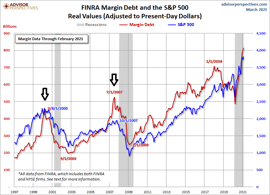 The chart of margin debt compared to the S&P 500 (SPX) from Advisor Perspectives shows the relationship since 1997.