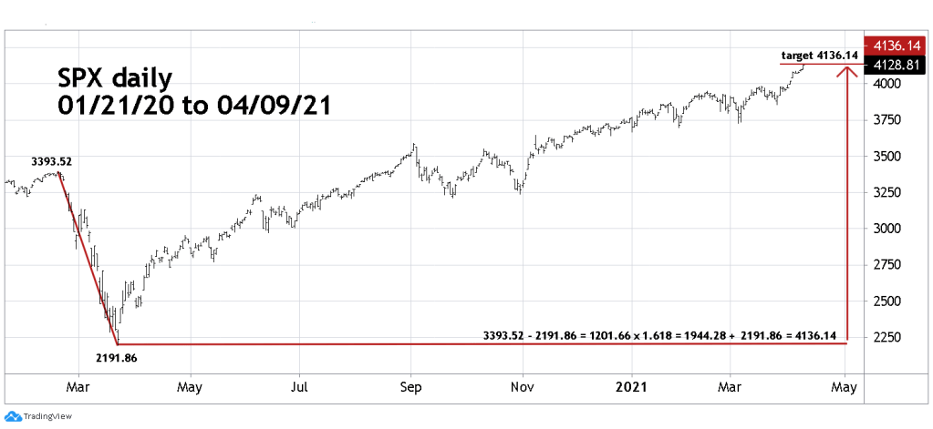 There are always alternate Fibonacci support/resistance levels. The daily SPX chart from January 2020 to April 2021 illustrates the next potential Fibonacci resistance level.