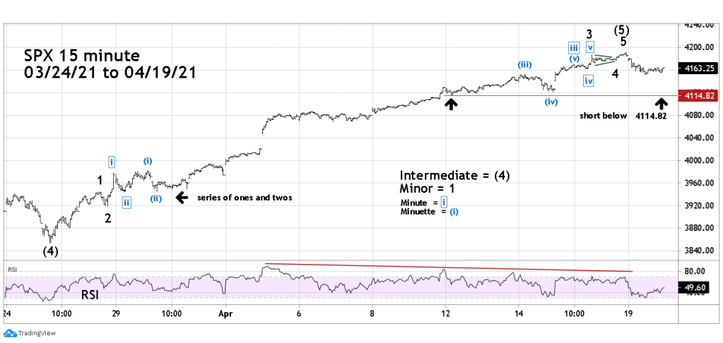 The rally that began 03/25/21 had a series of “ones” and “twos” which typically are the prelude to powerful market action in the direction of the primary trend. The upper part of the rally shows the corresponding series of “fours” and “fives”. The 15-minute RSI had a triple bearish divergence at the 04/16/21 peak.