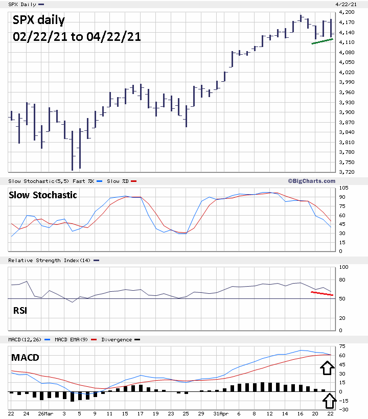 The SPX price low today was above the low recorded two days ago and closed today’s session almost unchanged from 04/20/21. Daily RSI was below its 04/20/21 reading – a bearish divergence.