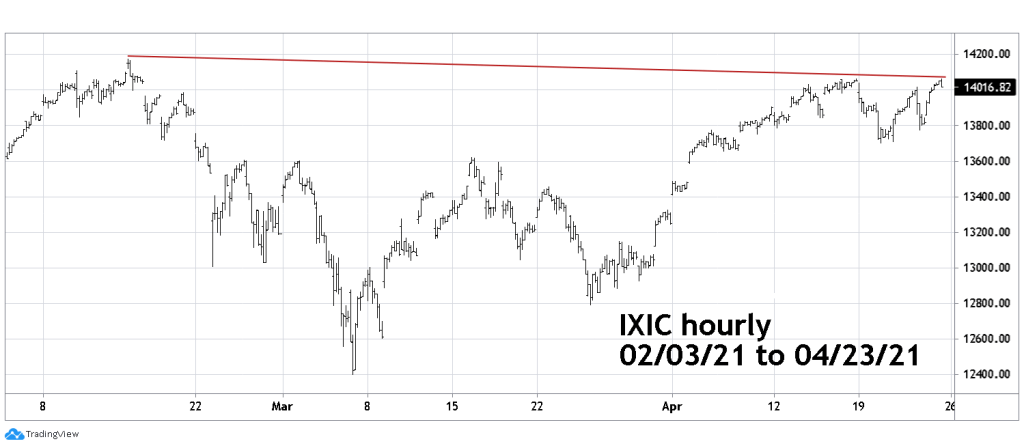 The hourly IXIC chart illustrates its continuing failure to break above its all-time high registered on 02/16/21.