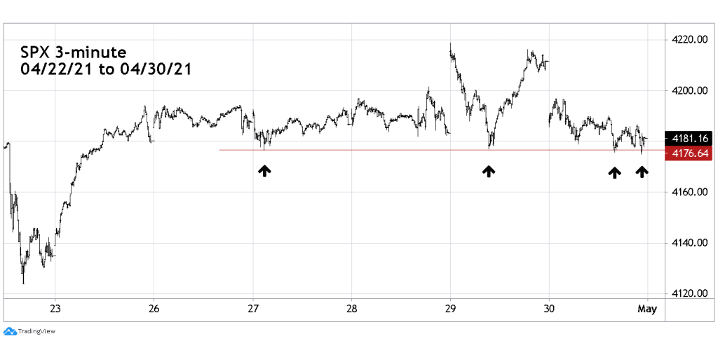 The 3 – minute SPX chart courtesy of Trading View illustrates some interesting price action.