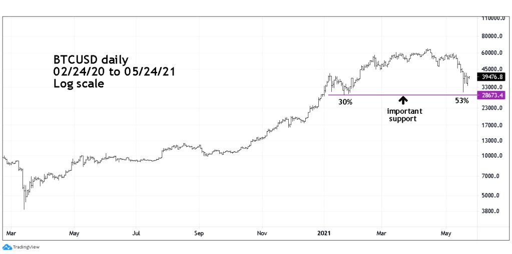 At 30066.00 BTCUSD was down 53% from its April 2021 all-time high, much larger than the biggest correction within the 2020 to 2021 bull move. The rapid and massive 53% drop by itself is powerful evidence that the Bitcoin speculative bubble has probably burst.