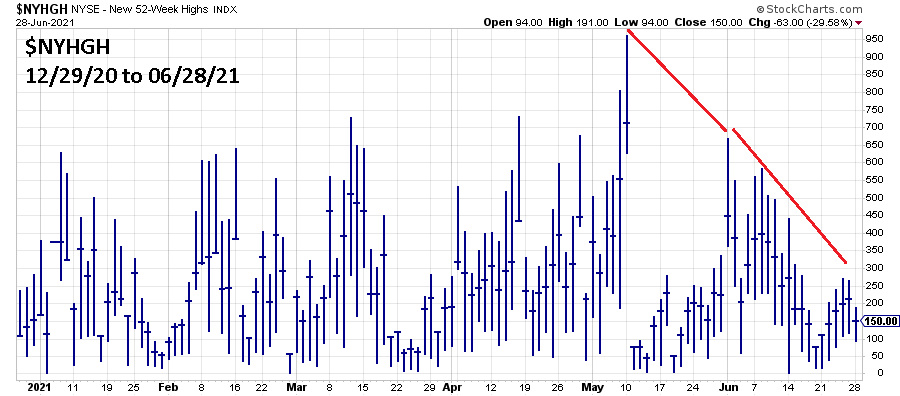 The daily chart of Nasdaq New – 52 – Week highs ($NAHGH) shows what’s been happening since the beginning of 2021.