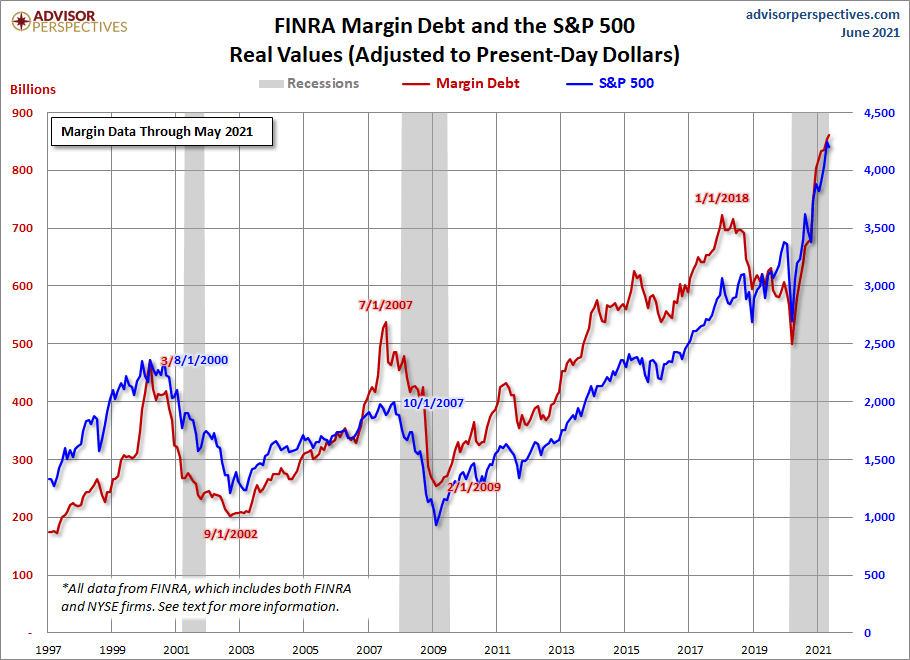 Evidence continues to suggest that US stocks are in the area of what could be a major top. The margin debt chart courtesy of Advisor Perspectives shows FINRA margin debt to the SPX though to May 2021.