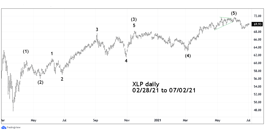 The 04/26/21 blog “Struggling to Rally” speculated that the Consumers Staples Fund (XLP) had completed an Elliott five – wave impulse pattern from the 03/23/20 bottom. Subsequently XLP moved to a new all-time high and peaked on 06/04/21.