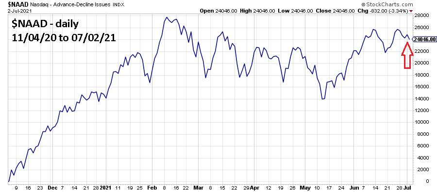 The daily Nasdaq Composite – Advance – Decline issues ($NAAD) illustrates what’s happening with this internal momentum indicator.