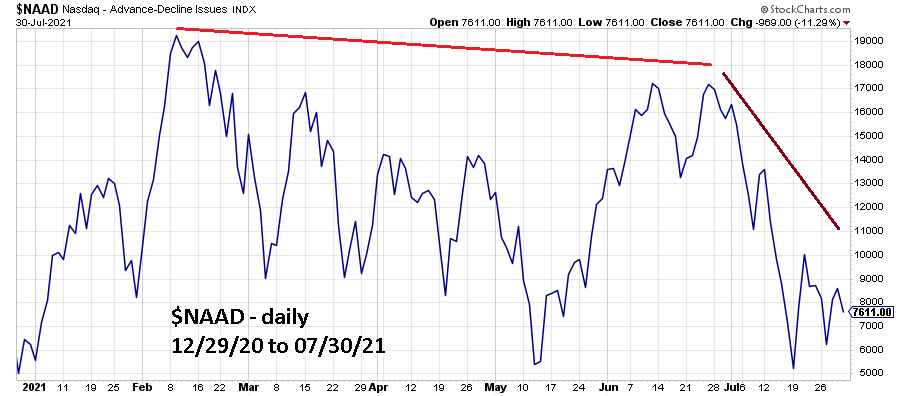 Since February 2021 the Nasdaq -Advancing – Declining Issues ($NAAD) has had bearish divergences vs. the Nasdaq Composite.