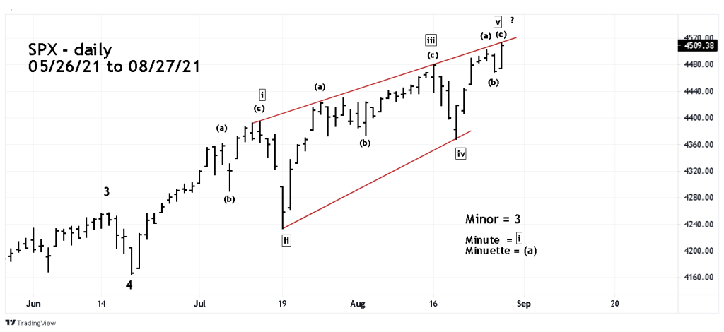 The S&P 500 (SPX) rally on 08/27/21 pushed beyond the leeway of major Fibonacci resistance at SPX 4437.63. This potential resistance level was first discussed in the 07/05/21 blog “The Next S&P 500 Resistance Level”. This Fibonacci point was derived by taking the growth rate of the March 2009 to April 2010 rally – presumed Primary wave “1” of 82.9% multiplied by 1.236 equaling a growth rate of 102.46%. This growth rate when added to the presumed Primary wave “4” bottom made in March 2020 at 2191.86 targeted SPX 4437.63. A wide leeway zone was given because the original Fibonacci coordinates are from a much lower area made more than ten years ago.