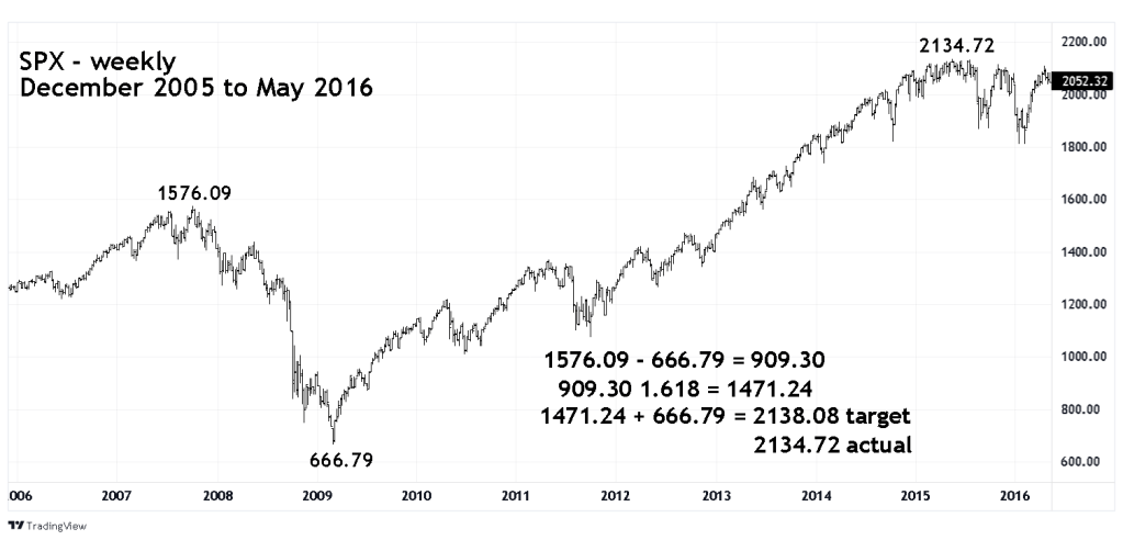 A 1.618 Fibonacci extension of the SPX 2007 to 2009 bear market came within 3.31 points of precisely forecasting the May 2015 peak. Subsequently there was a nine-month 15% bear move.