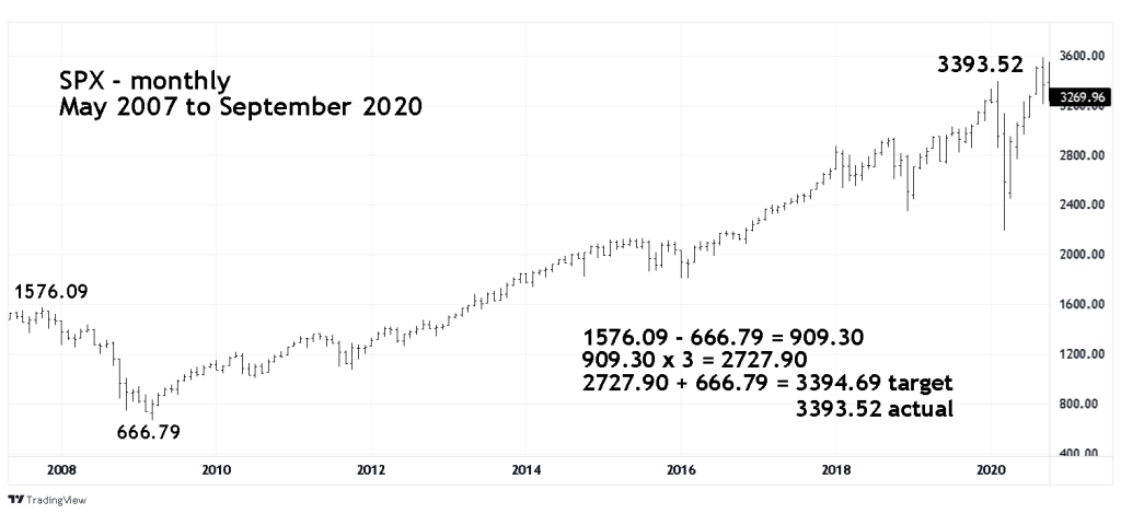 Multiplying the same 2007 to 2009 bear market by the Fibonacci number of 3 came withing 1.17 points of hitting the SPX peak in February 2020. What came after was a two-month 35% crash.