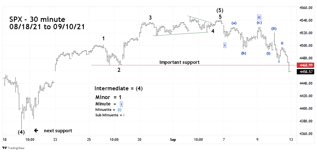 Note the strong moves up on the open of the 09/09/21 and 09/10/21 sessions, Minute wave “ii”- boxed, and Minuette wave (ii). The bulls quickly ran out of buying power, the rallies were completely retraced, and the SPX finished the session near the lows of the day. This could be a subtle hint that sentiment has shifted, and the bears are now in control.