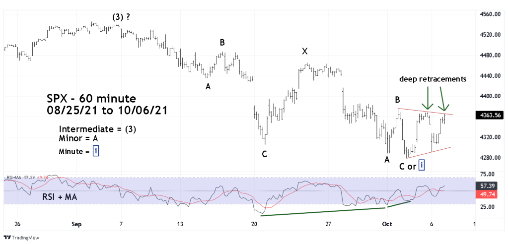 This post wave “B” decline could be a completed second wave “C”. If so, the entire Double Zigzag correction could be complete and implies a rally to new SPX all-time highs may have begun. Note the double bullish 60 – minute RSI + MA divergence at the SPX 10/04/21 bottom.