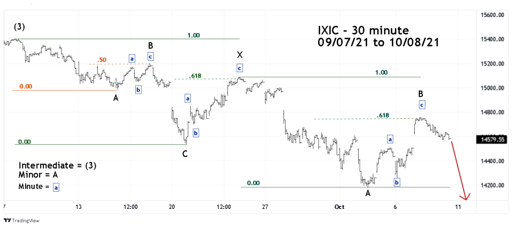The decline from the IXIC 09/07/21 all-time high could be Intermediate wave (4) of a developing Elliott extended Impulse wave up from the March 2020 bottom. Frequently there are Fibonacci relationships between waves “two” and “four.” The supposed Intermediate wave (2) was the largest correction of the bull move falling 12.87%. multiplied by the Fibonacci ratio of .618 yields 7.95%. The 09/07/21 to 10/04/21 decline was 7.93% bottoming at 14181.64 near the 07/19/21 correction low of 14178.66.