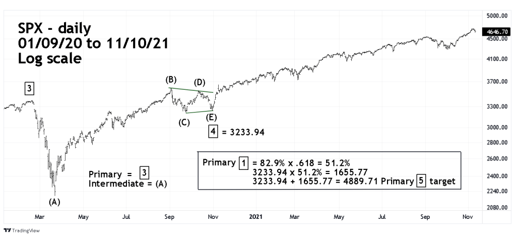 The growth rate of Primary wave “1” was 82.9% multiplied by the Fibonacci ratio of .618 yields a growth rate of 51.2%. A growth of 51.2% from the SPX 10/30/20 bottom of 3233.94 targets SPX 4889.71 as a possible termination point for Primary wave “5”