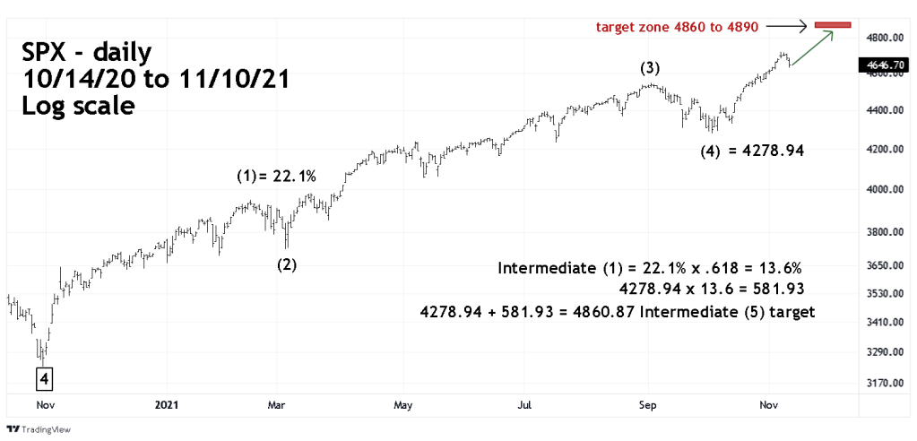 The supposed Intermediate wave (1) of Primary wave “5” had a growth rate of 22.1% from the 10/30/21 bottom. Multiplying 22.1% by the Fibonacci ratio of .618 yields a growth rate of 13.6%. A growth rate from the presumed Intermediate wave (4) bottom of 4278.94 targets SPX 4860.87 for the termination point of Intermediate wave (5).