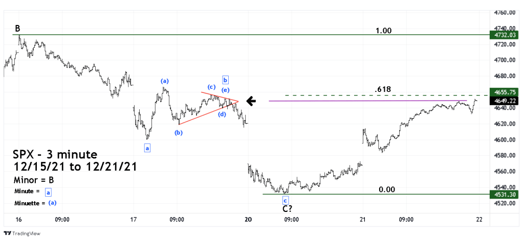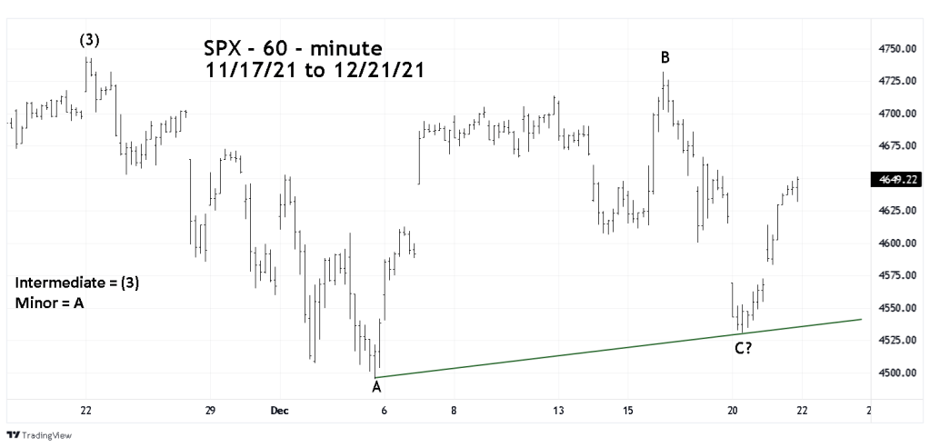The time span of the supposed wave “C” was only 16- trading hours. Minor wave “A” lasted 58 – trading hours – a ratio of 16/58 = 27.5%. The decline was much briefer than what usually happens relative to wave “A” and lowers the probabilities that wave “C” is complete. Its possible the bottom made on 12/20/21 could soon be tested.