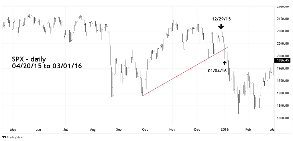 In May 2015 the SPX made an all-time. Price lingered near the top until August 2015 when there was a mini crash. The next rally moved to near the all-time high, then chopped lower. On 12/29/15 a short-term high was made. Then on the first trading day of 2016 the bears targeted and broke the rising trend line from the late September 2015 bottom. The break triggered another mini crash.