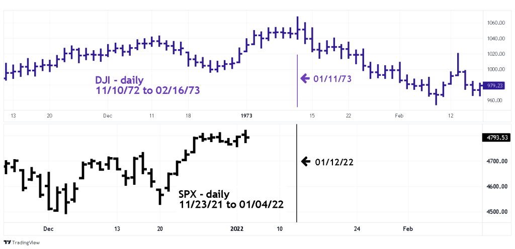 The daily DJI and SPX chart courtesy of Trading View compares the DJI 1973 peak with current SPX action.