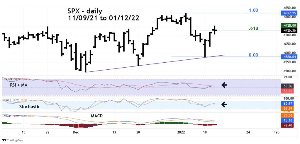 On 01/10/22 the S&P 500 (SPX) held above the rising daily trendline connecting the 12/03/21 and 12/20/21 bottoms. Today 01/12/22 the SPX pushed above the .618 Fibonacci resistance level of the 01/04/22 to 01/10/22 decline.