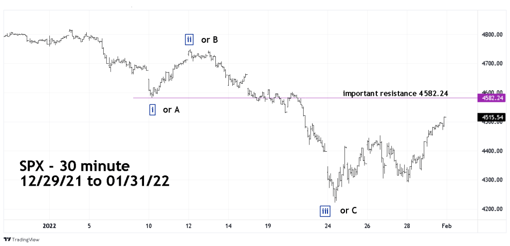 The 01/30/22 blog noted that SPX 4500.00 could be resistance. This level was where the supposed minute wave “iv” would be 1.618 times the supposed minute wave “ii.” The bulls eye level is 4489.00 with an 11-point leeway.
