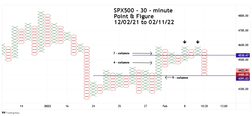 The 30 – minute SPX500 – Point & Figure (PF) chart provides clarity to the support/resistance points.